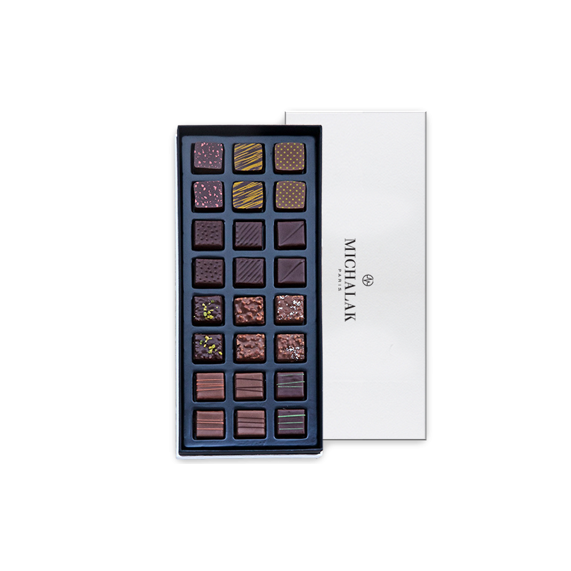 Assortiment de 24 bonbons chocolat: pralinés, fruités, pâtes d’amande, grands crus.