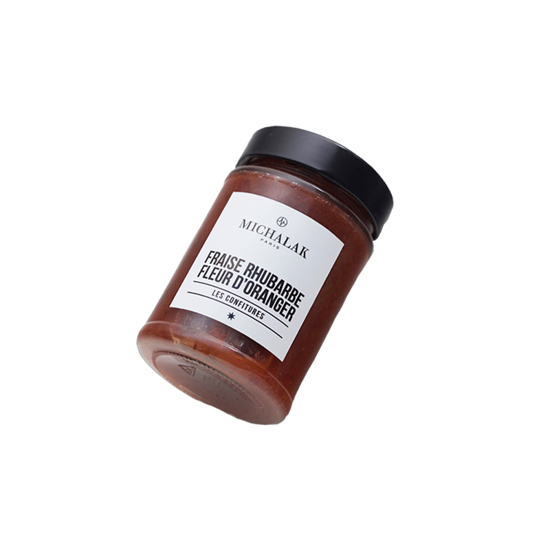 fruits 62% (fraise 21%, rhubarbe 31%), sucre, jus de citron, gélifiant: pectine de fruits, fleur d'oranger 0.5%