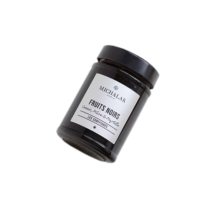 fruits 62% (cassis, mûre, myrtille), sucre, jus de citron, géllifiant (pectine de fruits).