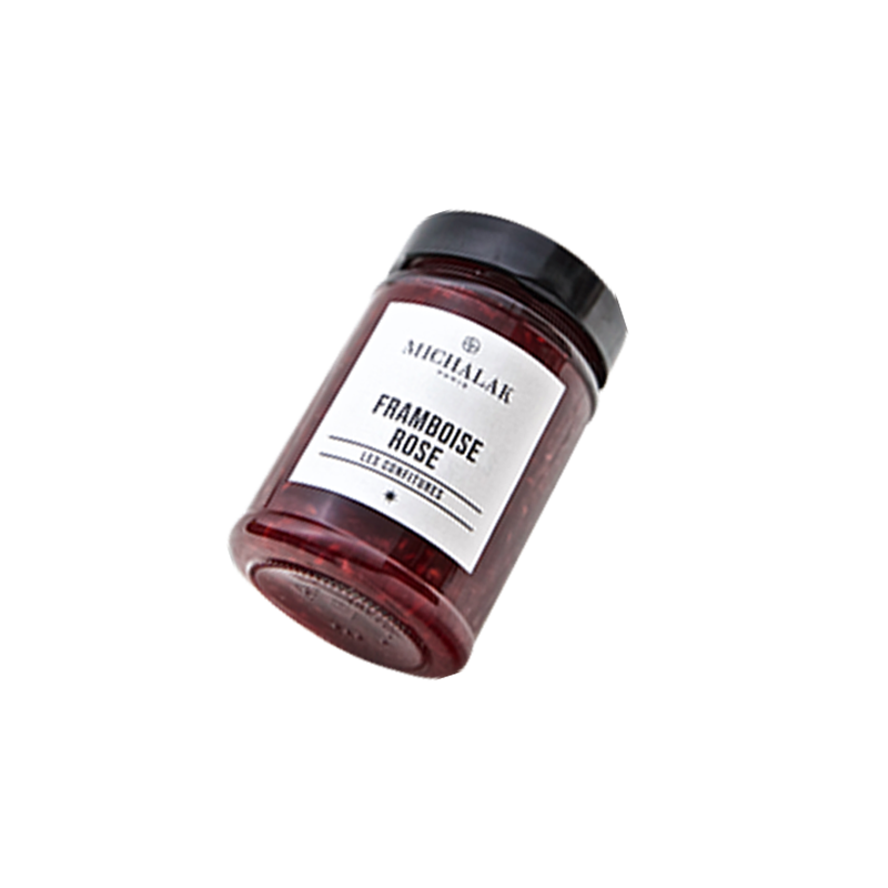 Framboises 59%, sucre, jus de citron, gélifiant (pectine de fruits, extrait de roses de Damas 0,10%).