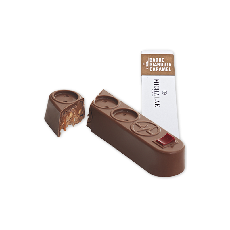 Gianduja lait très croustillant, éclats de noisettes et amandes, caramel mou à la fleur de sel.