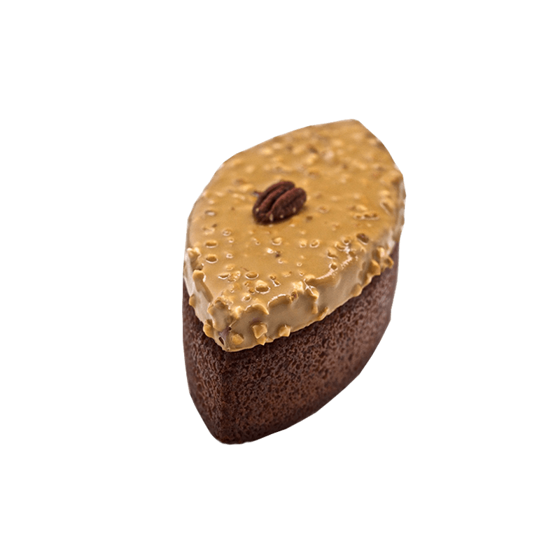 Cake noix de pécan, caramel dulcey, noix de pécan caramélisées, glaçage craquant chocolat blond.