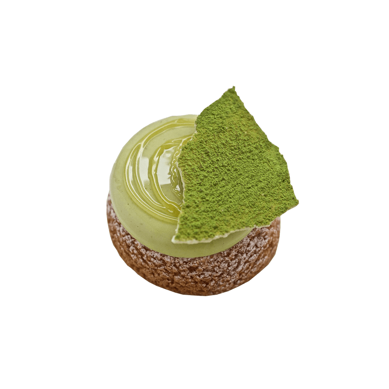 Pâte à choux, craquelin, crème diplomate vanille de Madagascar, feuille chocolat blanc, confit citron vert, crémeux citron vert-basilic.