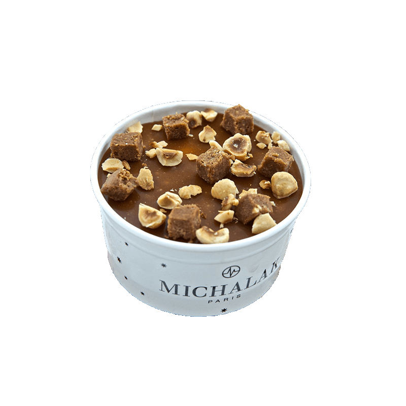 Glace et caramel tendre à la noisette, éclats de praliné feuilleté et noisette grillées.