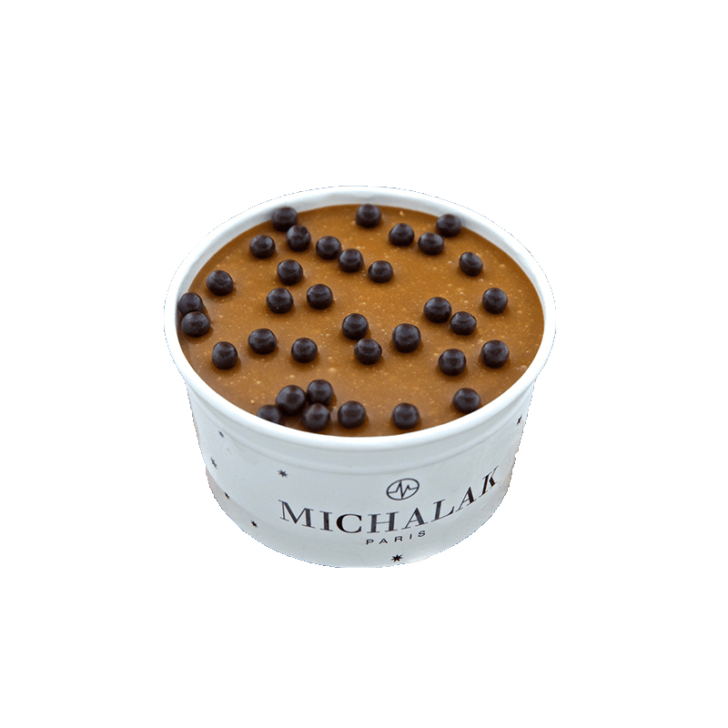 Glace au chocolat au lait avec un caramel tendre et des perles craquantes au chocolat (billes de céréales soufflées).