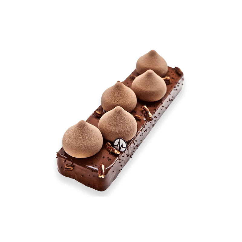 Croustillant Gianduja noisette, mousse allégée au chocolat noir, ganache Dulcey, cœur coulant praliné & noix de pécan.