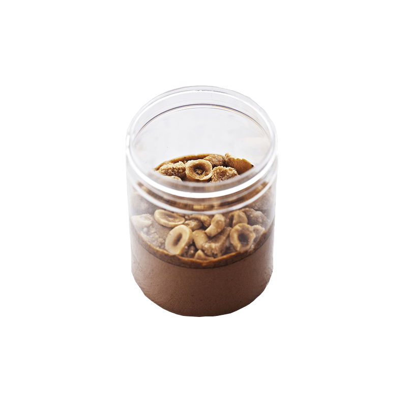 Mousse au chocolat grand cru, praliné noisette du Piémont, crumble croustillant, noisettes caramélisées.