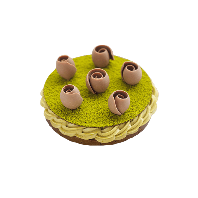 Croustillant praliné millefeuille pistaches grillées, crème mousseline cœur praliné pistache d'Iran, feuille de chocolat, copeau gianduja.