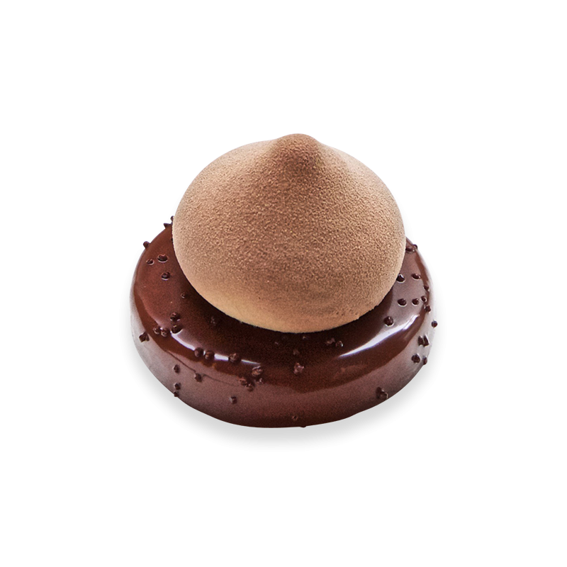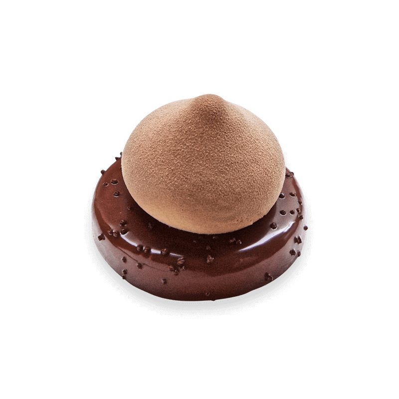 Croustillant Gianduja noisette, biscuit et mousse au chocolat noir, ganache dulcey & noix de pécan, cœur coulant praliné-noix de pécan.