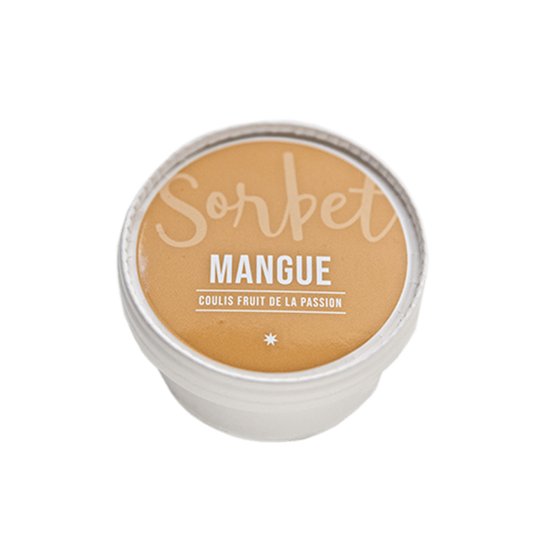 Sorbet à la mangue sur un coulis de fruits de la passion.