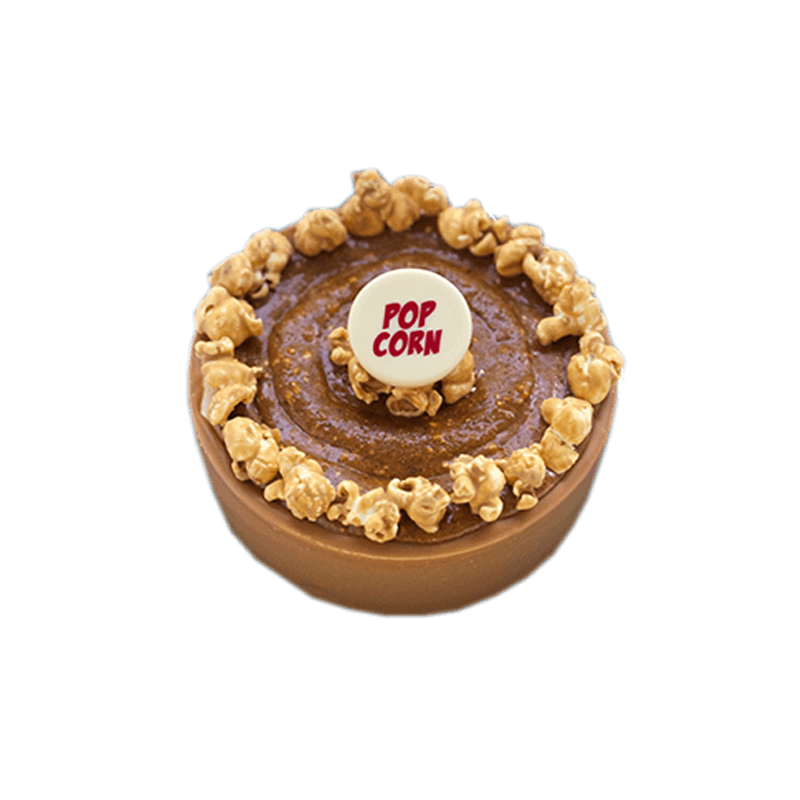 Biscuit amande, praliné au maïs et à la noisette du Piémont, ganache montée au chocolat Dulcey, maïs pop corn, enrobage craquant.